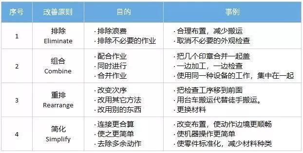 程序分析法(ECRS):整體性制造過程各作業運用剔除、合并、重排與簡化使之合理化。